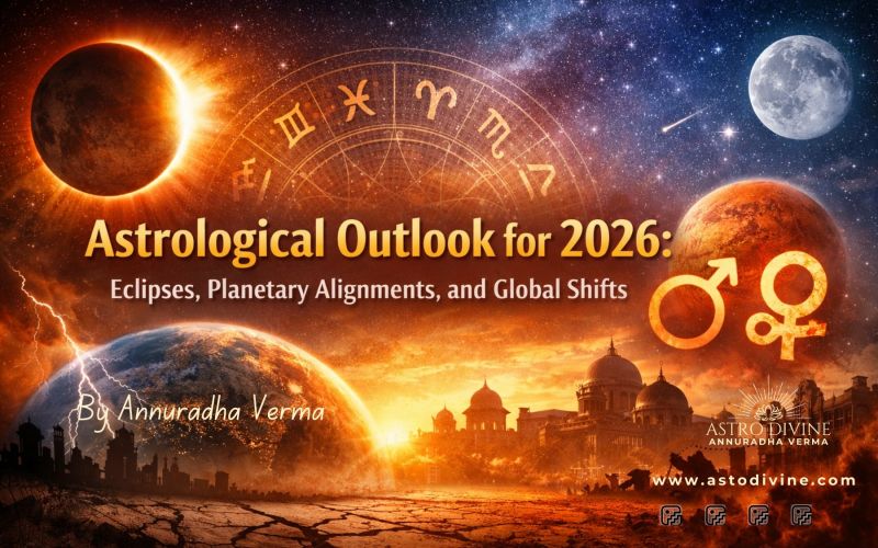 At the very beginning of 2026, the planetary positions are not considered very auspicious. The year will start with both a Solar Eclipse and a Lunar Eclipse, indicating instability and sudden changes. Later, in August 2026, there will again be a Solar Eclipse and a Lunar Eclipse.